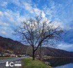 Meanwhile in the valley the Kanawha River runs strong and steady on its perpetual march to the Ohio River. A few water birds are seen playing follow the leader on the other side but even my 400 mm lens is too weak for a good shot at that range. I’ve seen what looks like a Hooded Merganser paddling in the flat water above the falls but I haven’t been able to get close enough to be sure. One by one the ducks take off from the river and sail over the falls. So I take out my phone and go for a vertical panoramic of the Walnut Tree on the lot. It’s an ancient tree and it’s massive crown seems to reach out and tickle the clouds as the roll by. I have to work quickly because I only have a few minutes for the stop and so after the shots are taken I climb back up into the big blue truck throw the phone on charge. Later as I do my touch ups and edits I noticed that the grass in the photo is no longer dry and brown as it was just three short weeks ago. Instead it’s fresh and green. Last year I noticed that some of tree buds had begun to swell near the end of February and the green grass is just one more sign that nature us slowly beginning to stir.